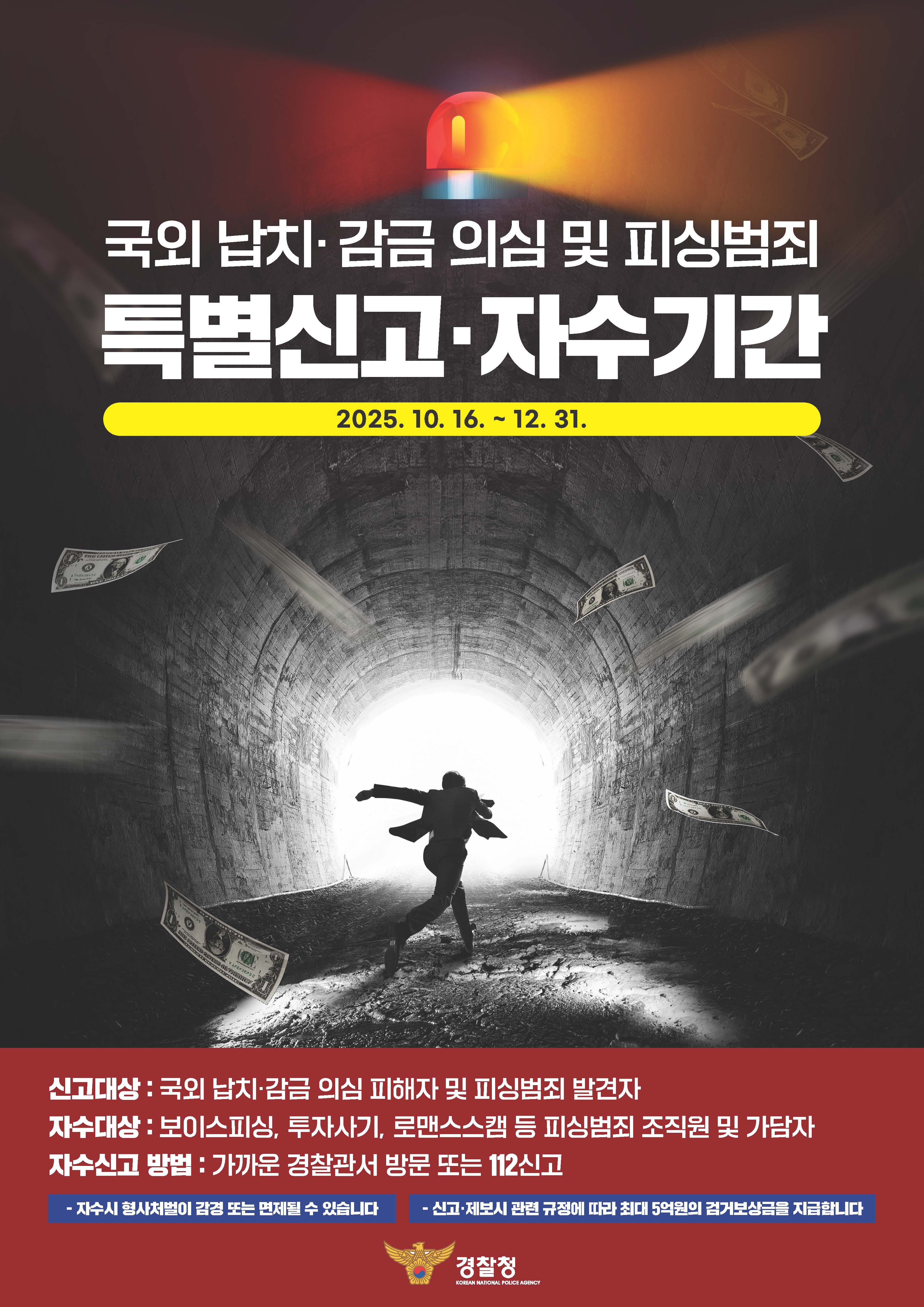 최근 해외에서 발생하고 있는 납치·감금 사례와 관련하여, 경찰청에서는 국외 납치·감금 의심 및 피싱범죄 특별신고·자수기간(2025.10.16.~12.31.)을 운영하고 있습니다.