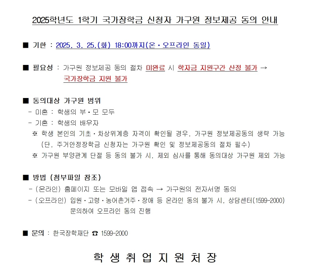[국가장학] 2025학년도 1학기 국가장학금 신청자 가구원 정보제공 동의 안내