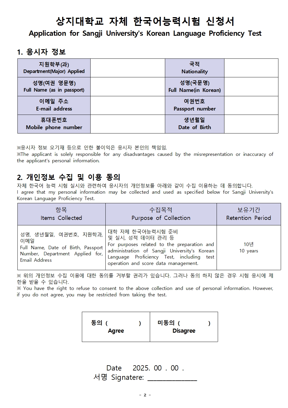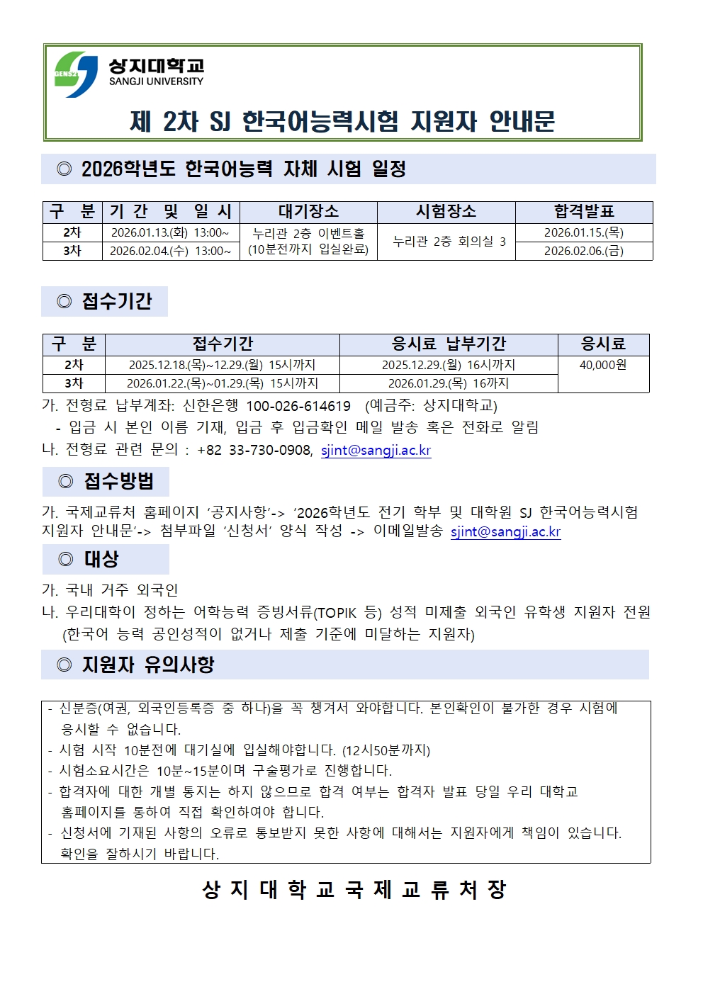 2025학년도 2차 SJ 한국어능력시험 지원자 안내